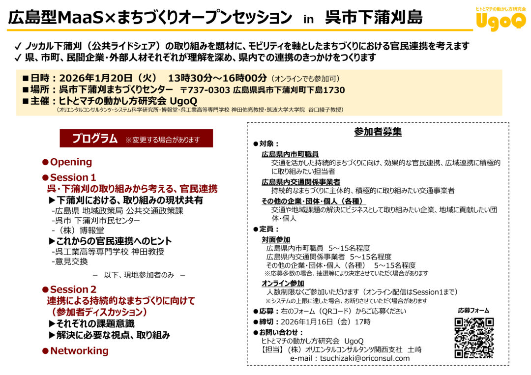 - ノッカル下蒲刈(公共ライドシェア)の取り組みを題材に、モビリティを軸としたまちづくりにおける官民連携を考えます